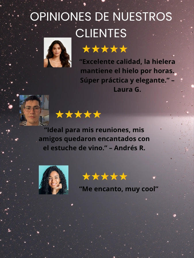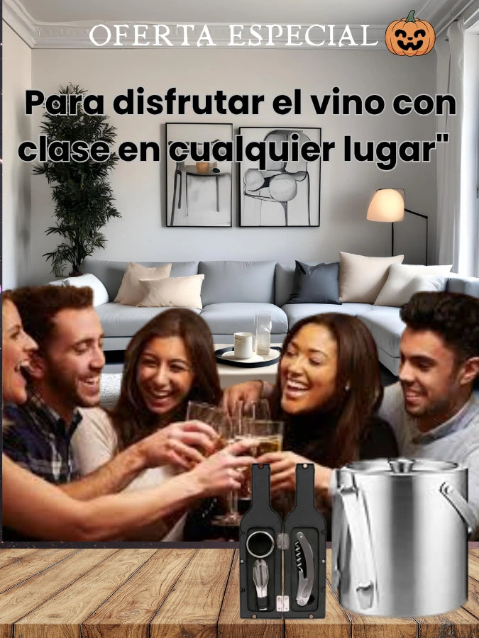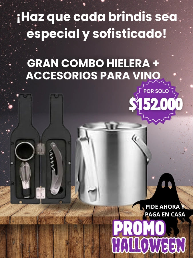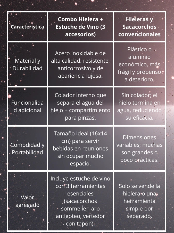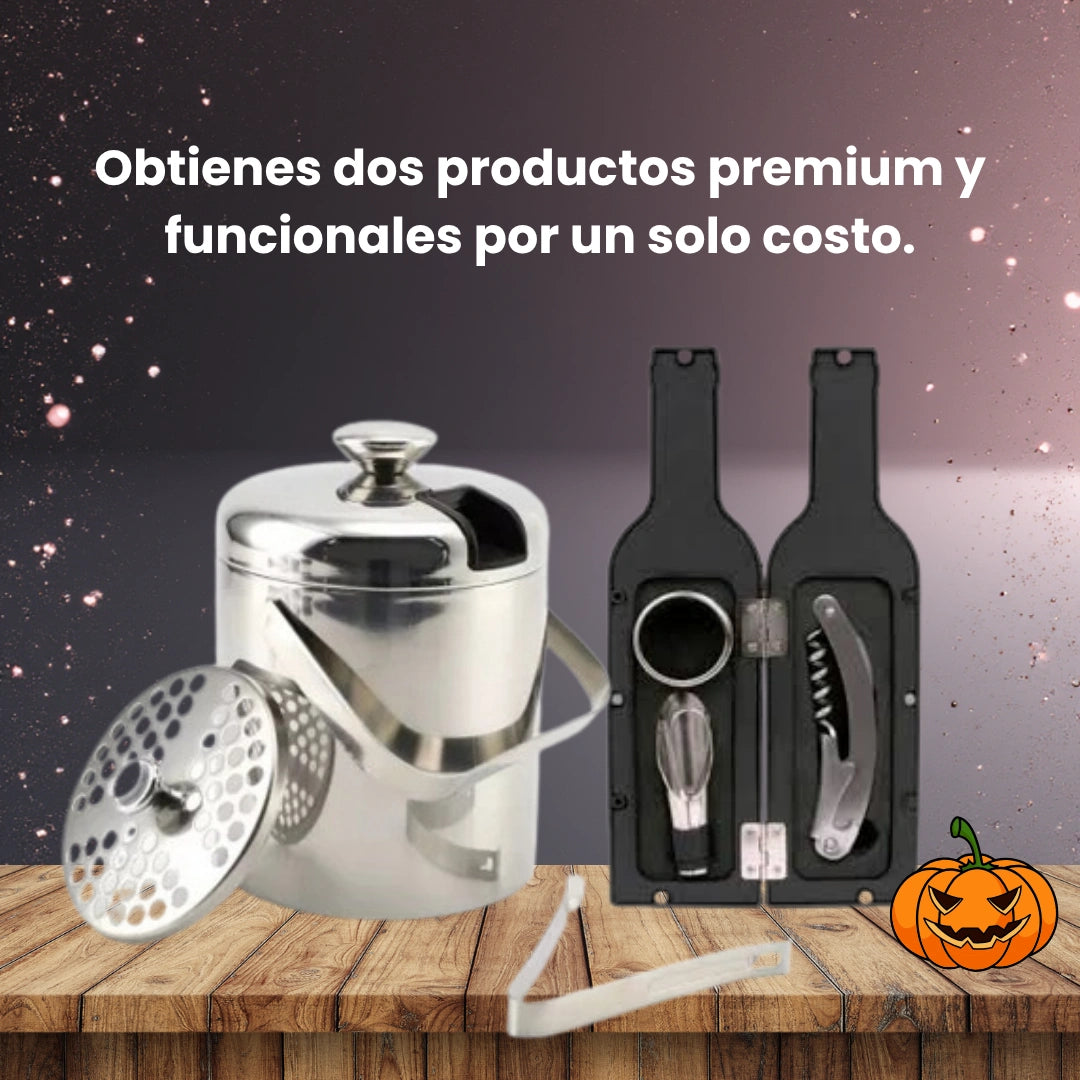 ¿Qué incluye exactamente el combo? 1 hielera de acero inoxidable con pinzas y colador integrado + 1 estuche en forma de botella con 3 accesorios para vino.